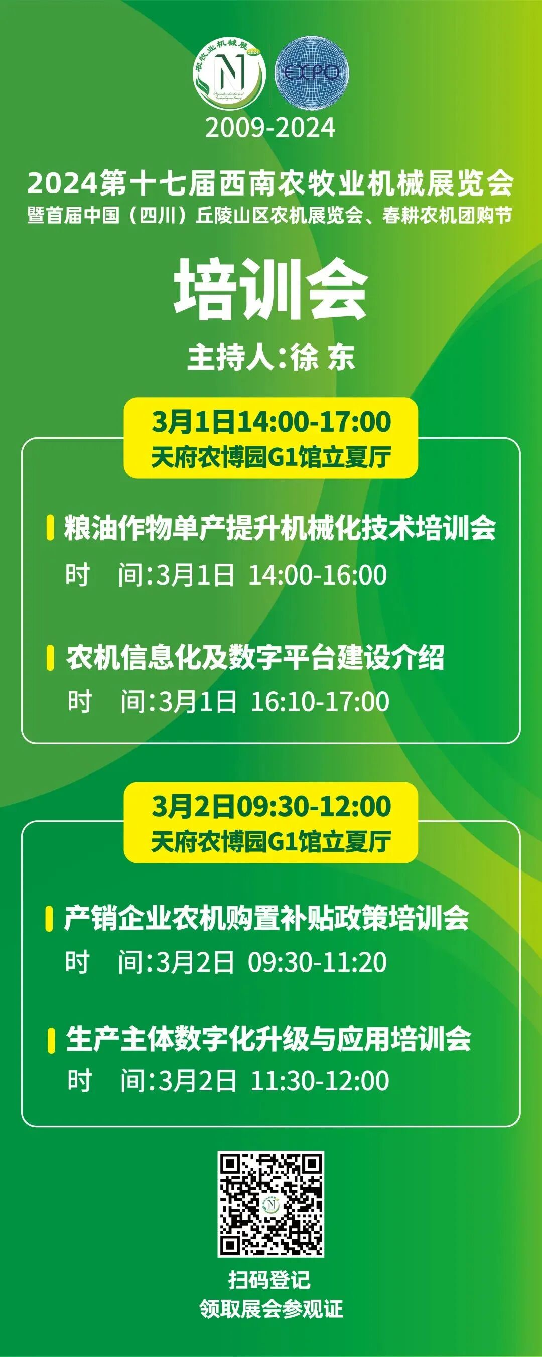 2024第十七届西南农牧业机械展览会暨首届中国(四川)丘陵山区农机展览会、春耕农机团购节定于2024年3月1日-3日在成都·天府农博园举办。